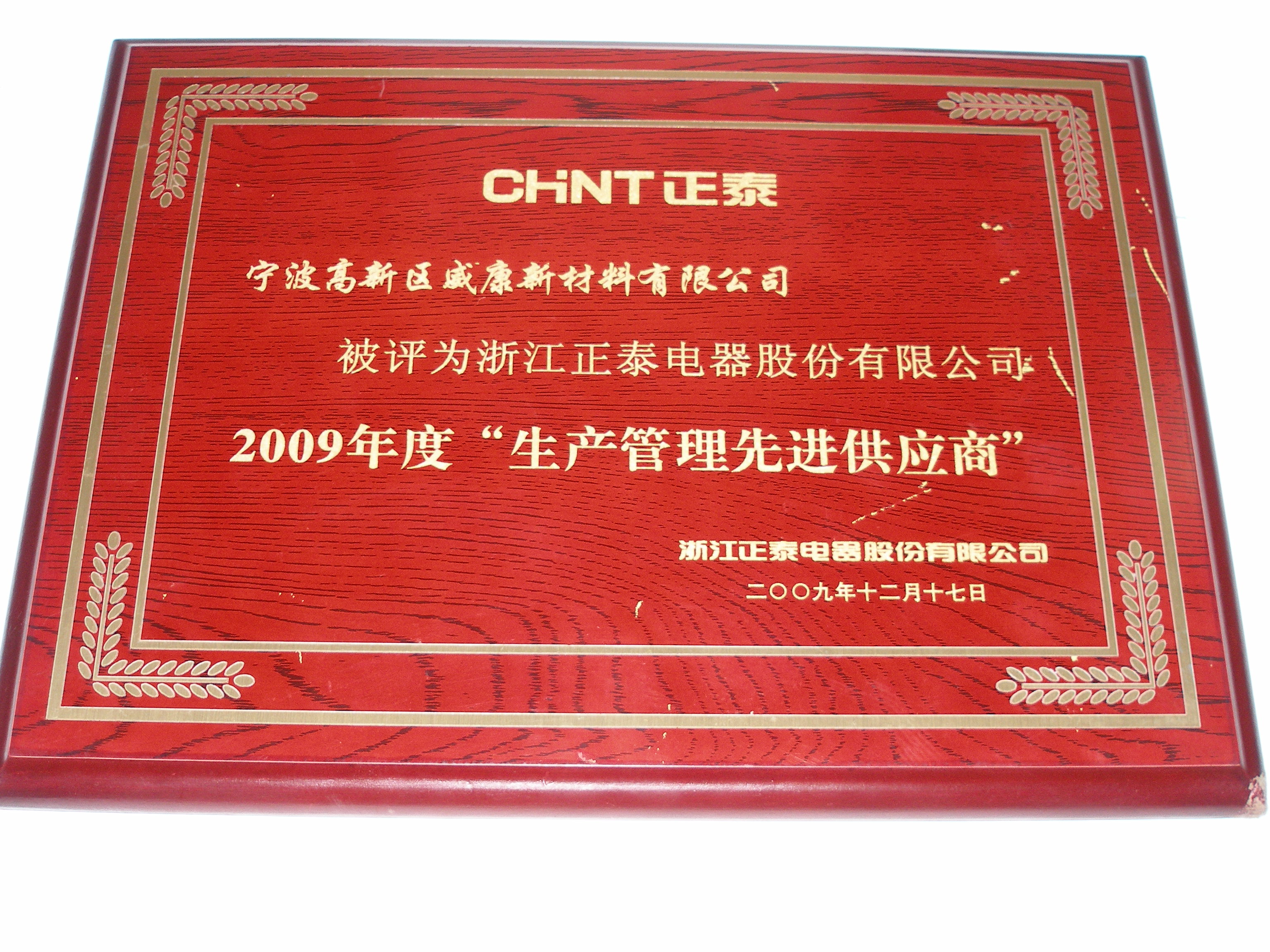 寧波高新區(qū)威康新材料有限公司被評(píng)為浙江正泰電器股份有限公司2009年度“生產(chǎn)管理先進(jìn)供應(yīng)商”